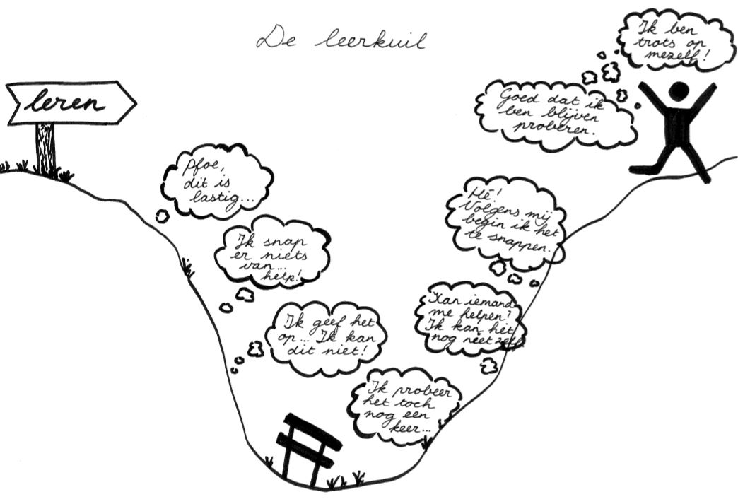 Vind jij een bepaald vak lastig? Zit je soms vast in je leerkuil en weet je niet hoe je omhoog kunt klimmen? Bekijk dan eens de tekening van de leerkuil en probeer te bedenken waar jij ergens zit in de leerkuil. Zo kun je nadenken over welke stap je daarna kunt zetten.